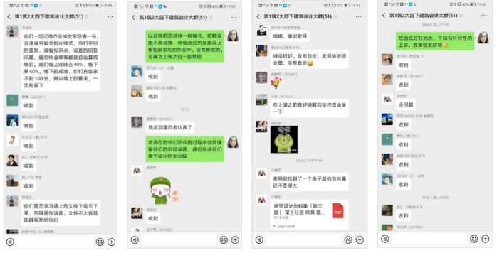 经过教学实践演练,发现利用“超星学习通”平台,可以有效检测与查验学生学习效果,通过后台学情数据分析,非常直观的展示学生学习情况;课程教学直播平台先后采用“钉钉”、“zoom”。发现“zoom”是一个比较适合设计类专业进行网络学习的平台,在一定人数范围内网络顺畅不卡顿,多人同时开麦与摄像头效果不受影响,便于师生沟通。老师与学生分别可以操控自己电脑屏幕对设计进行讲评,配有注释修改工具便于在设计方案上做标注;选用“微信”、“QQ” 发布通知、传输容量较大的学习资料,与学生讨论进行问题反馈。