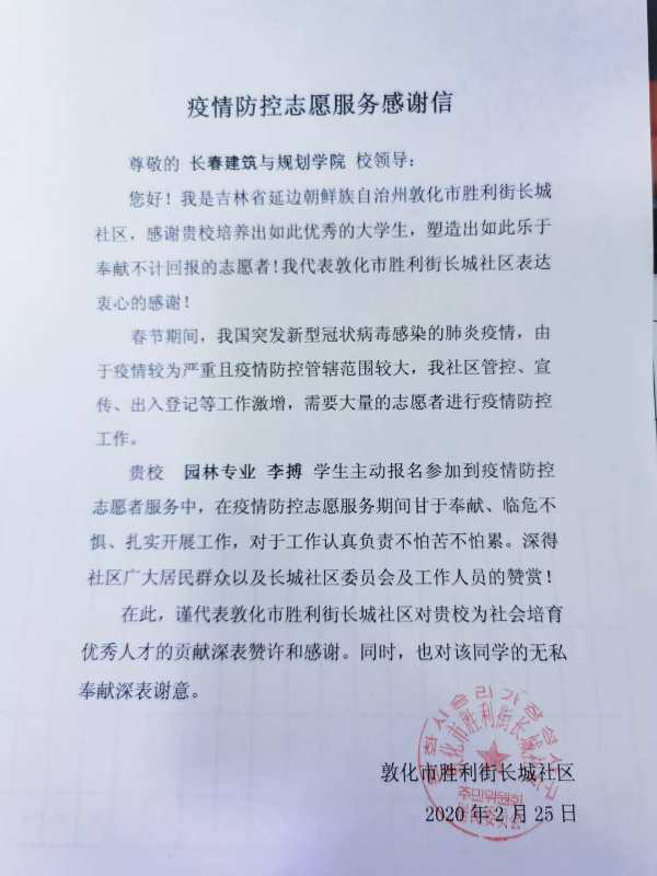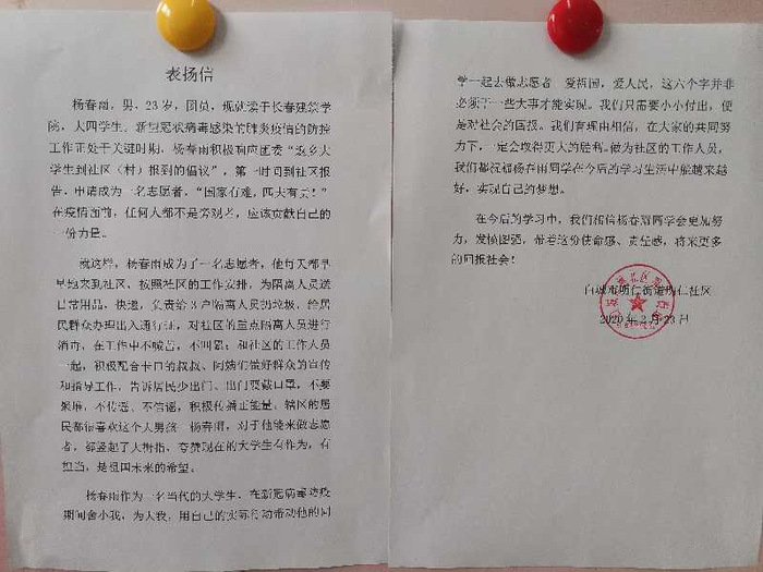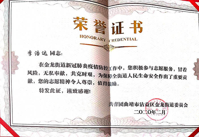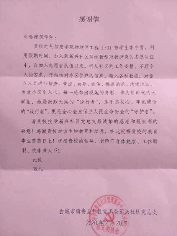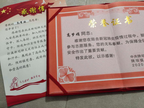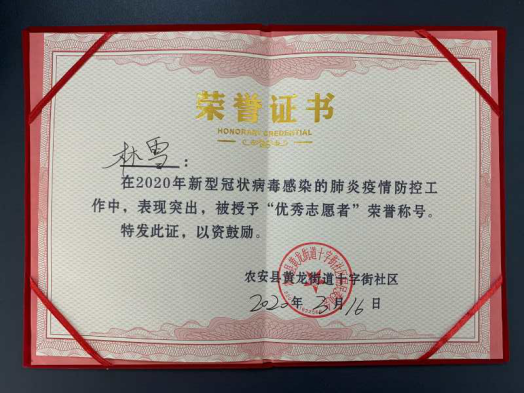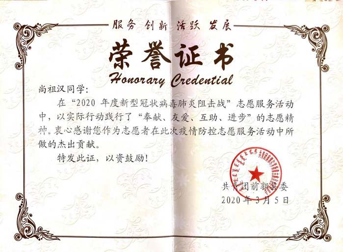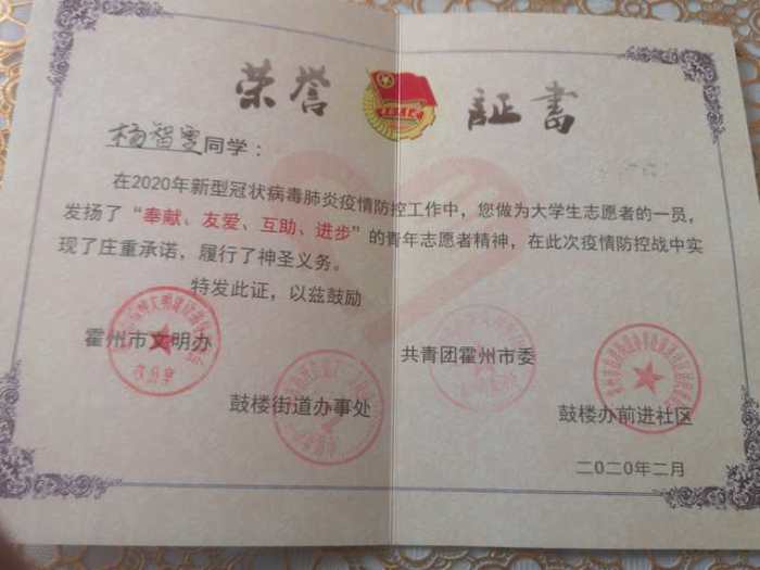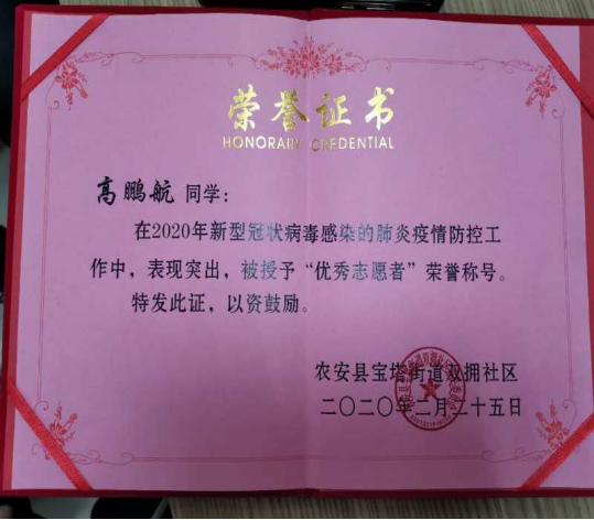 新冠肺炎疫情爆发以来,我校学子积极响应团省委关于“返乡大学生向社区报道”的号召,踊跃投身疫情防控阻击战中,为家乡的疫情防控工作贡献了自己的青春力量,他们无惧风险、迎难而上、表现突出,受到了当地团市委、市青协、社区的表彰。