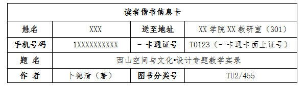 服务方式:教师将借书信息卡传递至QQ:45505066,核实信息后将图书借至教师证内,图书馆党员及时将所借图书送至教师所填地址(例表如下)。