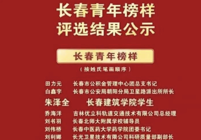 4月9日,长春青年榜样评选结果在共青团长春市委官方微信“长春共青团”正式公布,学校电气信息学院学生朱泽全获评“长春青年榜样”。