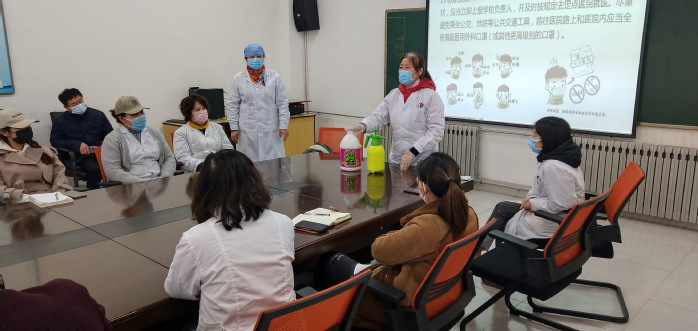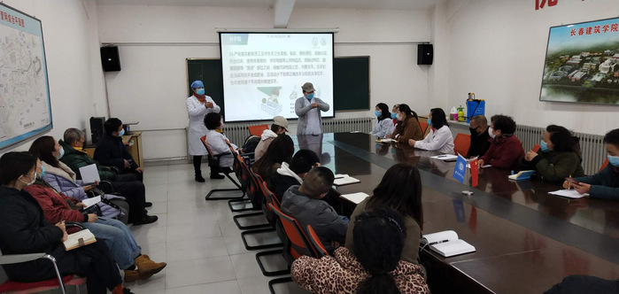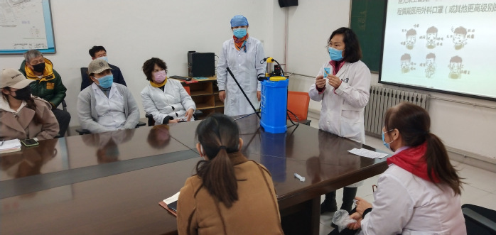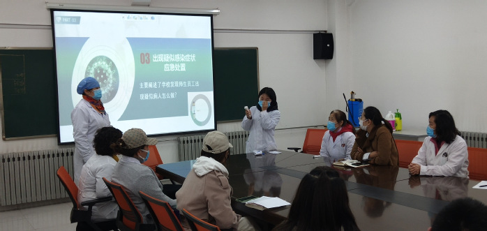 培训会上,徐宏着重讲了本次培训的意义和目的,明确了各单位场所的疫情防控工作责任。学校卫生所所长柳志医生为培训人员讲解了疑似感染患者处置流程,在工作学习生活中如何做好疫情防护等内容;孙丹护士讲解了洗手液洗手消毒的步骤与方法;孙建平医生讲解了如何进行84消毒液配比使用;陈丽华医生介绍了用喷壶、喷雾器使用优氯净配比量及操作方法;王迪护士介绍了测温仪及温度计操作方法及要求。