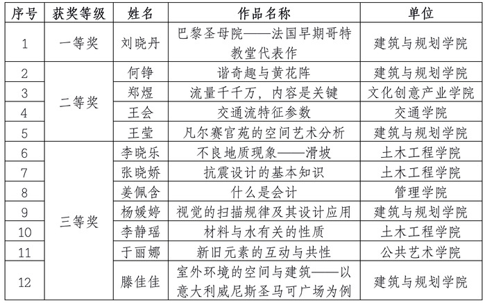 5月18日,2019吉林省高等院校应用型教育微课教学比赛评审结果揭晓,我校共有12名教师的参赛作品获个人作品奖,其中一等奖1项,为建筑与规划学院刘晓丹老师的参赛作品;二等奖4项,分别为建筑与规划学院何铮、王莹,交通学院王会,文化创意产业学院郑煜四位老师的参赛作品;三等奖7项,分别为土木工程学院李晓乐、张晓娇、李静瑶,管理学院姜佩含,建筑与规划学院杨媛婷、滕佳佳,公共艺术学院于丽娜七位老师的参赛作品。校长助理、教学科研服务管理中心主任兼教务处处长冯永、土木工程学院结构教研室主任路立娜、管理学院房地产教研室副主任闫波荣获“优秀评审专家”。学校荣获“省级微课比赛优秀组织奖”。
