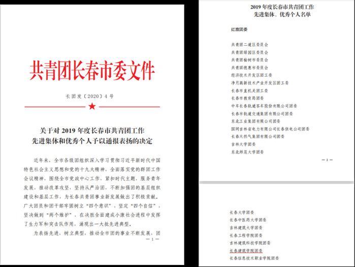 近日,共青团长春市委发布了《关于对2019年度长春市共青团工作先进集体和优秀个人予以通报表扬的决定》,学校团委荣获“2019年度长春市共青团工作红旗团委”称号。