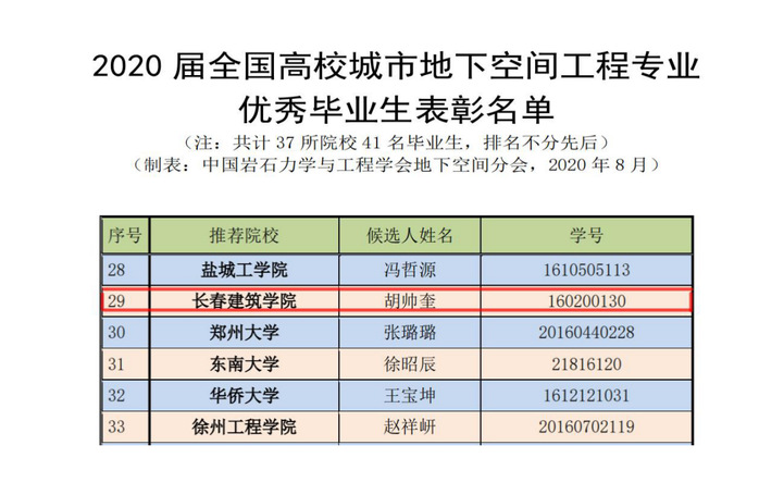 8月20日,中国岩石力学与工程学会发布了《关于表彰2020届全国高校城市地下空间工程专业优秀毕业生的通报》,学校土木工程学院城市地下空间工程专业胡帅奎同学在来自全国众多高校推荐的参评学生中脱颖而出,成为获评“2020届全国高校城市地下空间工程专业优秀毕业生”的41位同学之一。