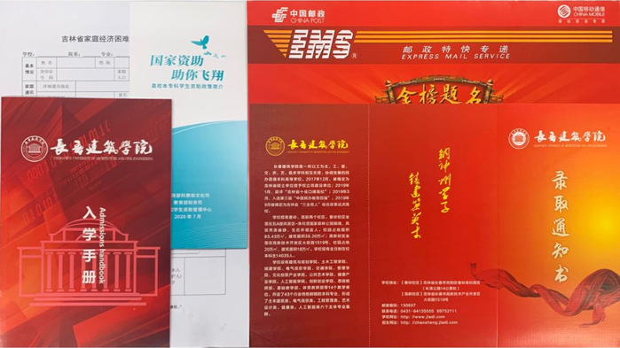 (寄递信封中包括:入学手册、录取通知书、高校本专科学生资助政策简介、吉林省家庭经济困难学生认定申请表)