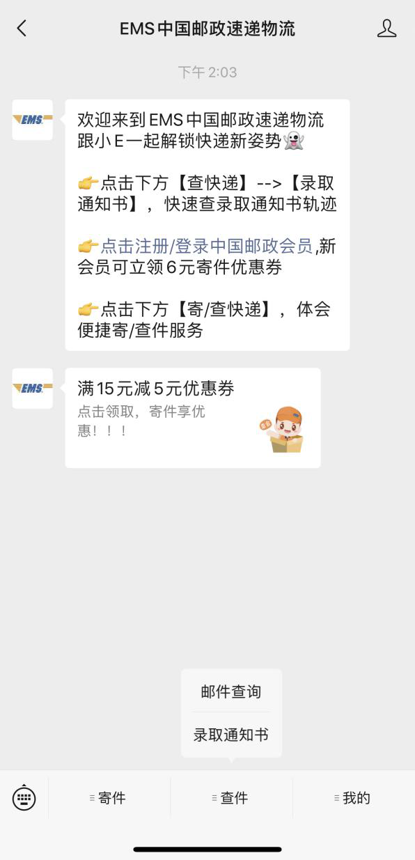2. 关注“EMS中国邮政速递物流”微信公众号,点击下方查件-录取通知书,输入准考证号或考生号查询。