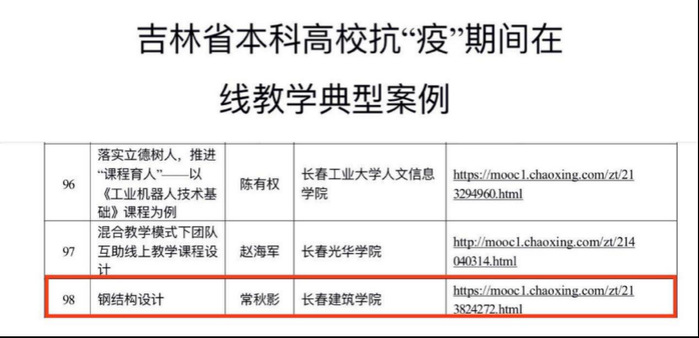 近日,吉林省教育厅公布了省本科高校抗“疫”期间在线教学典型案例遴选结果,首批确定112门在线教学案例为吉林省本科高校抗“疫”期间在线教学典型案例,我校常秋影副教授主讲的《钢结构设计》在线教学案例入选并在“吉林省教师发展联盟平台”进行集中展示,充分展现了我校抗“疫”期间在线教学的工作成效。