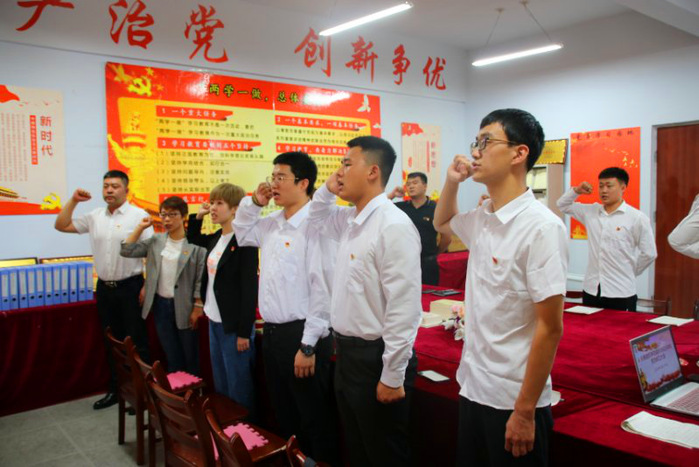 宣誓仪式上,在齐唱《国际歌》后,全体党员面向党旗,举起右手,在领誓人的带领下,用慷慨激昂的语气,庄严神圣地向党旗宣誓,表达对党的忠诚,为共产主义事业奋斗终身的决心。