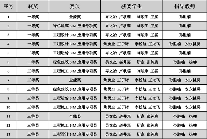 本次竞赛共有来自省内的13所建筑类院校组成70支代表队,共 360名学生参加。大赛设全能奖以及四大专项奖,分别是工程设计BIM应用、绿色建筑BIM应用、工程造价BIM应用以及工程施工BIM应用。在土木工程学院孙胜楠、杨柳和安永健男三位老师的带领下,12名学生经过精心准备和训练,学校学生在比赛中展现出扎实的理论知识和娴熟的专业技能,取得了优异成绩。