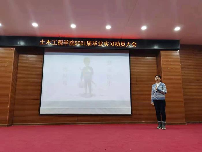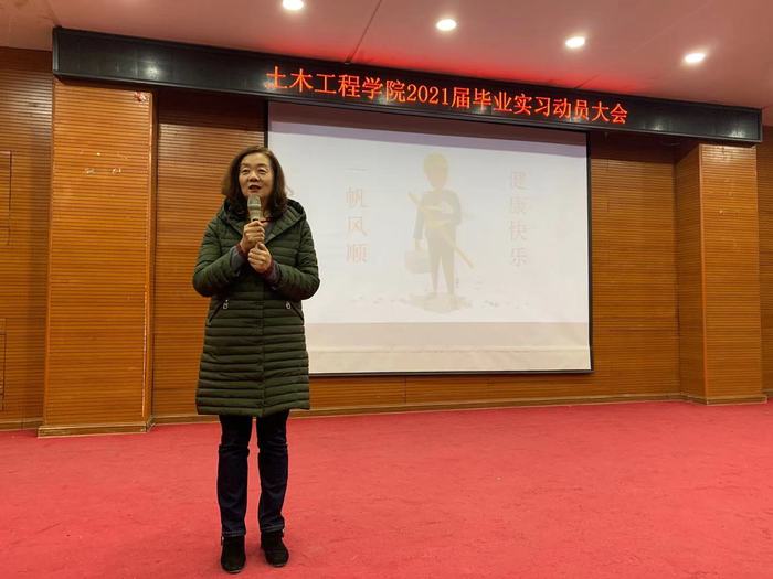 会上,土木工程学院副院长陈岩对学生毕业实习作动员。她详细介绍了毕业实习的目的意义、院校两级组织管理、时间安排、内容要求、成绩考核等相关事宜。对于此次校外实习,她重点强调了要选择正规企业的与专业相关的岗位,严格办理外出实习相关手续,疫情期间减少外出,如有变动及时上报,要加强安全意识、遵守企业工作规程,充分认识到此次实习的重要性,要摆正心态,为完成角色转换打下良好基础。