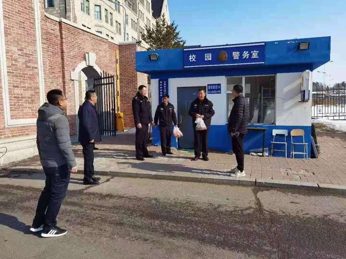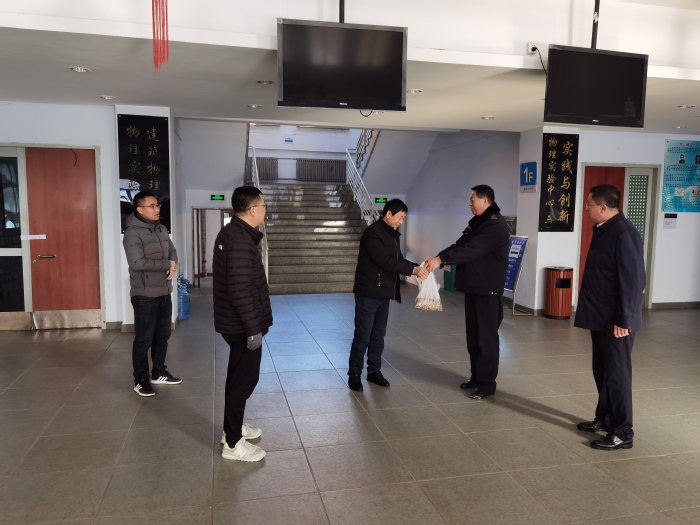 孙雷一行先后看望了校门卫、锅炉房、各学院门卫值班室的值班人员,送上春节慰问品,对大家坚守岗位、履职尽责,保障校园安全和冬季供暖安全运行的辛勤付出表示感谢,希望大家要严格落实值班制度和有关要求,保障寒假和春节期间校园安全稳定。