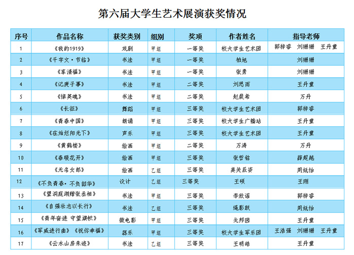 3月23日,吉林省教育厅发文公布了吉林省第六届大学生艺术展演活动获奖名单。学校荣获优秀组织奖,多项参展作品获奖,其中,一等奖4项(戏剧类1项,书法类2项,绘画类1项),二等奖2项(书法类2项),三等奖11项(舞蹈类1项,朗诵类1项,声乐类1项,绘画类2项,设计类1项,书法类3项,微电影类1项,器乐类1项)。