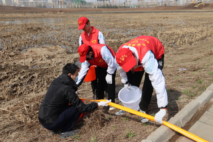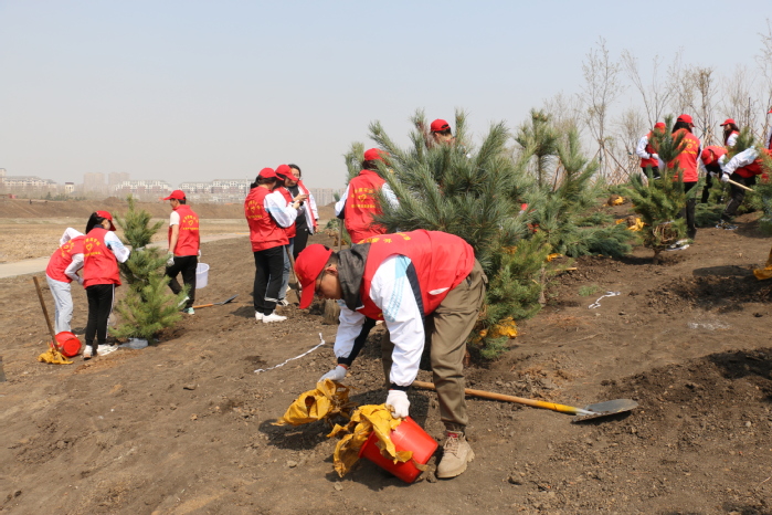 揭牌仪式后,学校志愿者们直奔植树区域,大家挽起衣袖,三人一组,团结协作,干劲十足,挖坑、栽苗、培土、浇水,每一道工序都一丝不苟,处处充盈着高度的热情和饱满的干劲,经过近2个小时的奋战,百余棵松树整齐地挺立在锦春园内,为今春增添了一抹新的生机。大家看着那一片自己亲手种下的树苗在微风中摇曳,露出幸福且满足的笑容。植树活动结束后,学校青年志愿者们自觉留下与环卫人员一起清理了现场遗留的垃圾。