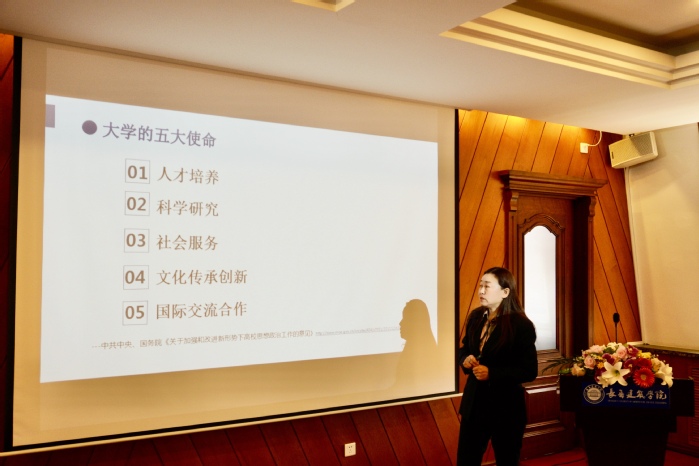 王玫代表学校董事长及校领导对新入职教职工表示热烈欢迎,并围绕“融入长建 协同发展”为主题作入职培训讲座报告。她以民办教育、大学使命、本科教育、应用型本科高校等概念开篇,从“责任·使命”“历程·展望”两个篇章深入展开,带领新教职工回顾了集团和学校的发展历程,结合董事长治校方略和学校办学理念、办学定位,总结了学校“十三五”时期的发展建设成果,展望了学校未来“高质量、高水平、高速度”发展规划目标,通过分享董事长在创业、办学过程中一个个生动感人的故事,让新教职工深刻感悟了董事长“投资教育,回报社会”“打造盛世企业,为人民创造福祉”的责任与情怀,深刻理解了“教育之本在于立德树人”,作为教育工作者,应“德”字为先,坚守职业道德底线,教书育人、使命如磐的深刻内涵。