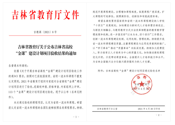 近日,吉林省教育厅下发了《吉林省教育厅关于公布吉林省高校“金课”建设计划项目验收结果的通知》(吉教高[2021]8号),经学校申报、资格审查、专家组网上评审,我校2019年由陈敏杰教授立项建设的《基于工程应用和创新能力培养的<混凝土结构基本原理>课程》和于哲教授立项建设的《<室内设计>情境教学课程》顺利通过“金课”建设计划项目验收,被认定为省级一流本科课程。