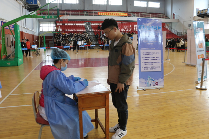 疫苗接种师生通过预建档、领取并签订接种知情书、预检登记、信息核对、疫苗注射、现场留观、领取接种证明7个步骤,依次完成疫苗接种。现场紧张有序,秩序井然。