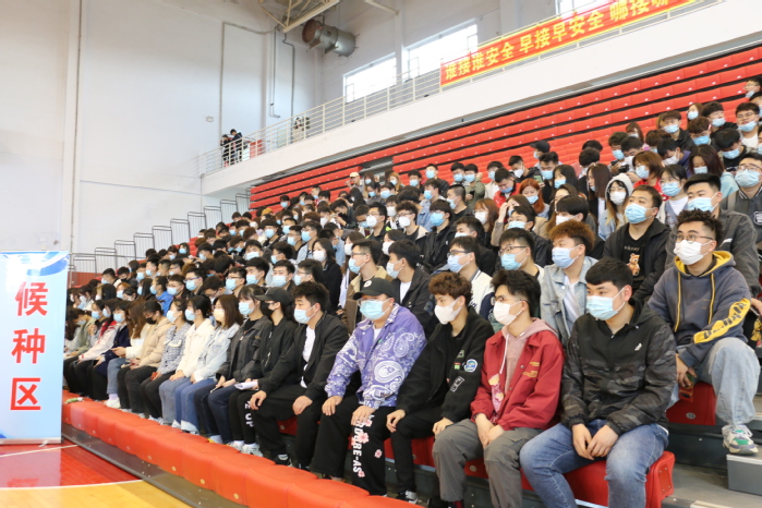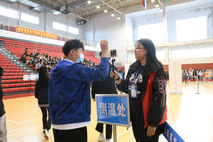 早上7时,师生按照次序集结等候,携带身份证,在入口处经过体温检测,查验“吉祥码”后进入场馆。