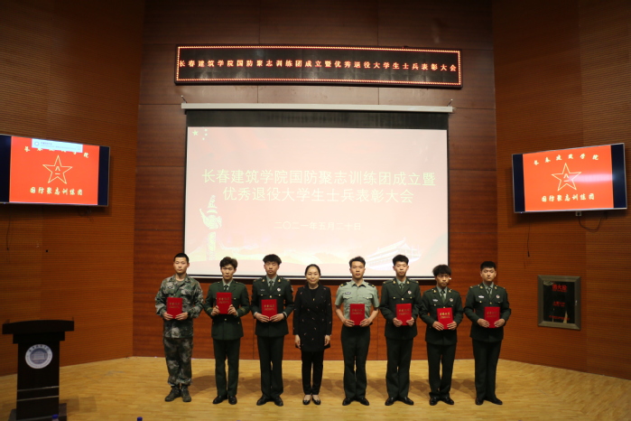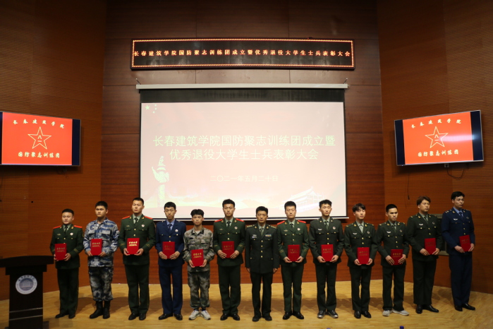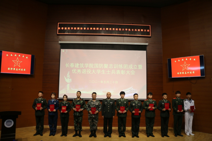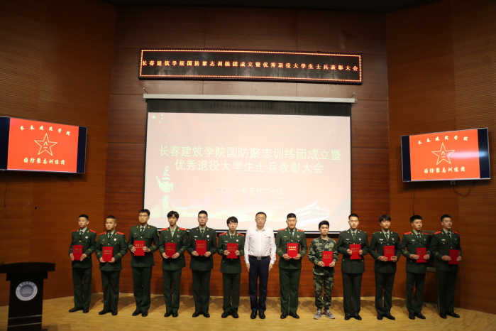 为不断完善退役大学生士兵培养机制建设,创新培养观念,健全培养路径,进一步加强国防教育,将其纳入大学生政治思想教育组成部分中,发扬退役大学生“退伍不褪色,退役不退志”的优良作风,按照上级有关文件精神,5月20日下午,学校在建筑与规划学院报告厅召开国防聚志训练团成立暨优秀退役大学生士兵表彰大会。长春市双阳区武装部部长王学刚、政委杨小尤,学校党委书记李贵海,党委副书记、副校长吴延红,学生工作处处长王浩强,各学院党总支书记、副书记,分团委书记和学生服务管理中心各处室负责人,优秀退役大学生士兵代表、校级学生组织部分学生代表共计150余人参加会议。会议由学生工作处武装部部长王丹童主持。