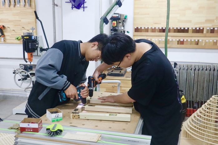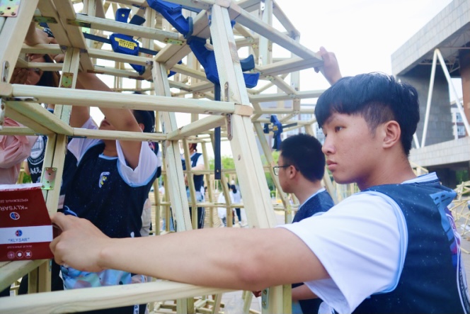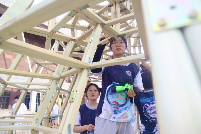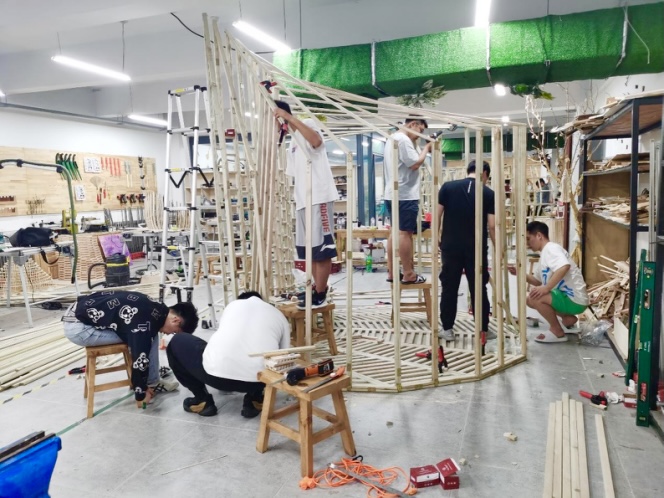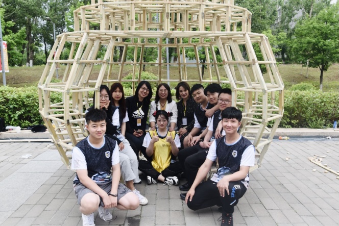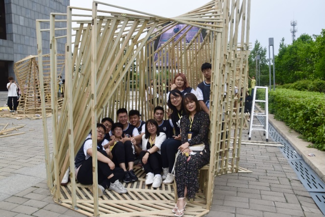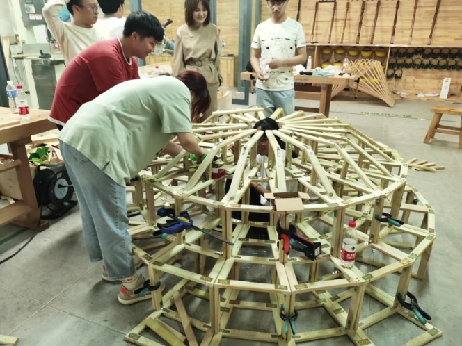本次比赛分两个阶段:校内加工与现场搭建。这是一次全新的挑战,学校参赛师生从方案设计到作品完成历时半个月,在一轮又一轮的讨论中,确定了最终的参赛方案,将功能、空间、形态等要素统一植入作品。其中,学校建筑与规划学院师生参赛作品“风曦园”以其合理的受力结构、富于变化的律动之美、神奇的光影效果、舒适的人体尺度荣获大赛二等奖;参赛作品“万木千帆”以其多线支撑的井然秩序、多层间隔的逐次拔高,以直营曲、柔美动人的立意荣获大赛三等奖。