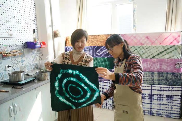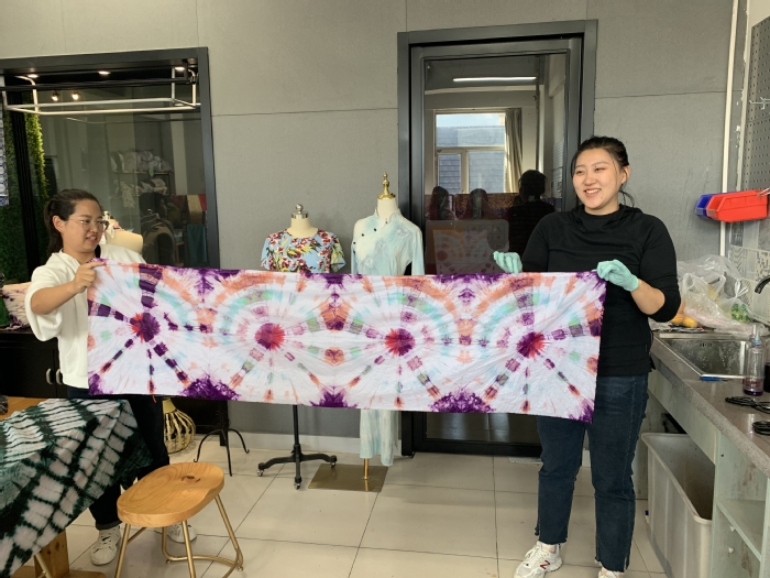 在温馨友好的氛围中,参加活动的老师们一一完成了自己的扎染作品,大家相互展示,脸上洋溢着自信和幸福的笑容。