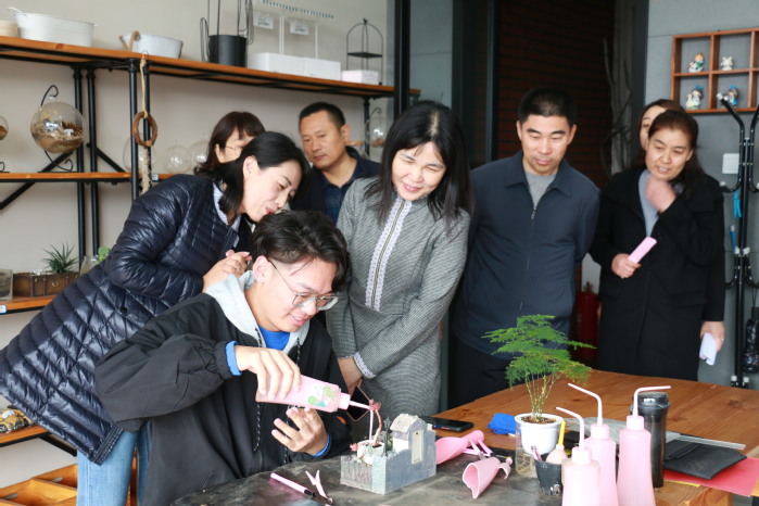 慈建华一行还参观了学校的沙盘展示区、政务服务大厅、大学生社团活动中心、现代教育信息中心、民革党员之家图书室、国际会议中心、公共艺术学院创意街区以及建筑与规划学院实训空间等。
