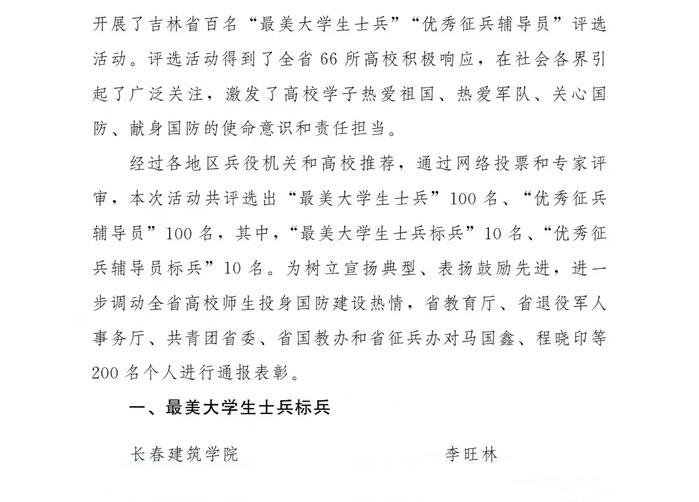 为贯彻落实习主席给南开大学8名入伍大学生回信精神,鼓励引导高素质青年投身军营报效祖国,2021年5月至9月,省教育厅、省退役军人事务厅、共青团省委、省国教办和省征兵办联合组织开展了吉林省百名“最美大学生士兵”“优秀征兵辅导员”评选活动。评选活动得到了全省66所高校积极响应,在社会各界引起了广泛关注,激发了高校学子热爱祖国、热爱军队、关心国防、献身国防的使命意识和责任担当。经过评选,学校文化创意产业学院党总支副书记吴刚荣获“优秀征兵辅导员标兵”称号;学校城建学院辅导员郭娟荣获“优秀征兵辅导员”称号;学校交通学院交通工程专业1801班学生李旺林荣获“最美大学生士兵标兵”称号;学校城建学院建筑环境能源与应用工程专业1801班学生王新华荣获“最美大学生士兵”称号。