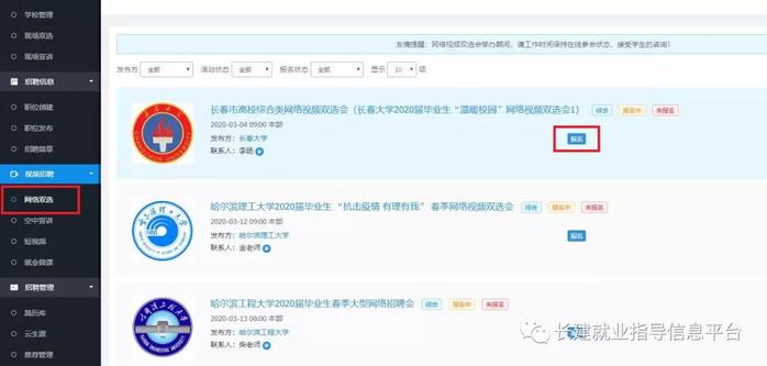 单位报名:进入网络双选,选择“长春建筑学院2022届毕业生校园网络招聘月”,点击右侧“报名”键,提交相应报名信息,学校审核后在线参会。