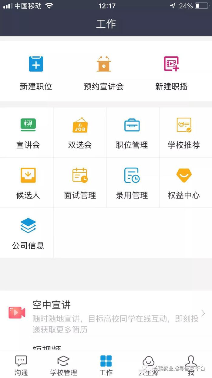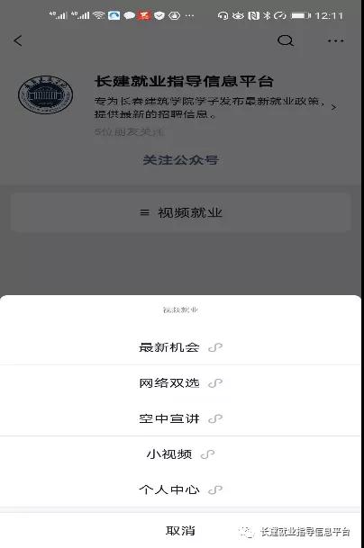 关注学校就业微信公众号“长建就业指导信息平台”,点击“视频就业-个人中心“,进入学校就业小程序。
