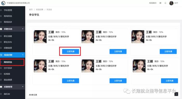 在线参会:点击在线参会进入网络会场,查看我校在线参会学生,点击右侧“查看简历”,查看学生简历,感兴趣请直接点击学生姓名后方“沟通”键,进入沟通和面试页面。