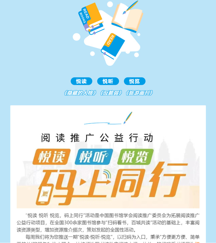 “旧书不见百回读,熟读精思子自知。”寒假期间,学校图书馆依托微信公众号,充分发挥多渠道运行模式,面对全校师生读者的需求,延续推出系列阅读服务。“好书推荐”“悦读 悦听 悦览”系列活动持续更新,以“扫码看书、扫码听书、扫码看期刊”的服务形式为读者送去更多优质资源,更有其他形式多样、内容丰富的资源助力广大读者的学习之路。
