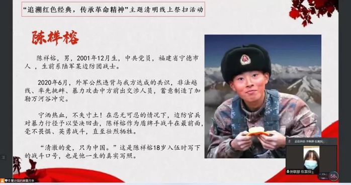 拳拳赤子心,殷殷爱国情。为缅怀革命先烈,传承红色基因,弘扬中华优良传统,时刻铭记革命烈士为解放国家和民族不畏牺牲的英勇事迹,4月4日18时30分,长春建筑学院192名学生代表开展“追溯红色经典,传承革命精神”主题线上清明祭扫活动。