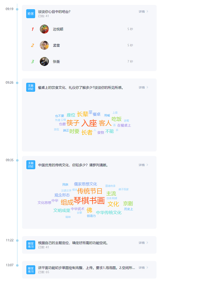 在这一阶段教师主要采取的是非正式评价,在整个教学过程随机进行。也是课程教学的互动环节,主要通过学习通推送主题讨论、随机选人、随堂练习、课后作业几个部分进行。主要目的是确保学生活动的方向并鼓励学生对研究过程进行反思,有助于学生认知自己对探究活动付出的努力程度。