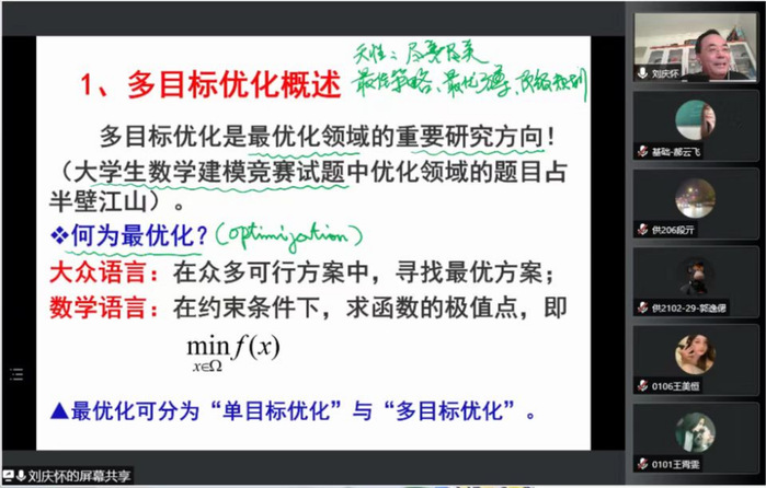 5月10日下午,学校基础教学部数学教研室邀请长春工业大学刘庆怀教授作《多目标优化在数学建模中的应用》为主题的学术报告。报告会利用腾讯会议平台,在线进行讲授并与学生互动。报告会由基础教学部副主任高俊勇主持,数学教研室教师及对数学建模感兴趣的同学参与了报告会,上线人数一度超过500人。