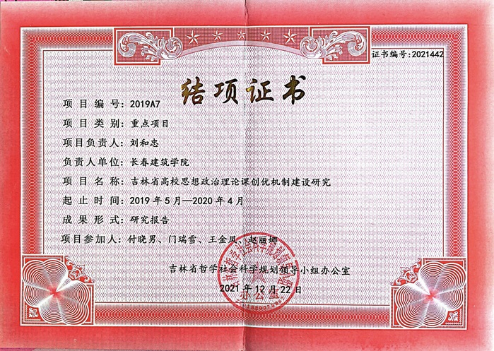 此项目于2019年获批立项,是长春建筑学院申请获批的又一个省级社科基金重点项目。项目研究成果聚焦新时代高校思想政治理论课改革创新要求,探索构建高校思政课创优机制建设模式,研究分析典型高校思政课创优机制经验,具有典型的借鉴应用价值。