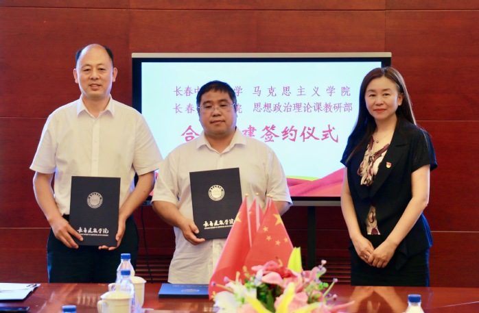 为了充分发挥马克思主义学院学习研究宣传马克思主义主阵地作用,坚持用习近平新时代中国特色社会主义思想铸魂育人,切实办好思想政治理论课,学校思想政治理论教研部与长春中医药大学马克思主义学院于6月16日下午在图书馆会议室签署共建协议。校长张兴海、党委书记王宝龙、党委副书记、副校长王玫出席签字仪式。长春中医药大学马克思主义学院党委书记徐德斌、副院长徐永军、副院长付晓男、办公室主任姜浩等一行4人前来学校参加签字仪式。