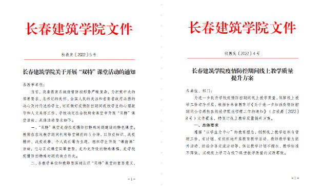学校高度重视疫情期间教育教学工作,科学研判疫情发展变化形势,坚持疫情防控和教育教学“两手抓、两不误”。学校教务处统筹指导各教学单位在疫情防控期间组织开展在线教学工作,确保教学节奏不乱、力度不减、进度不缓。学校先后制定并下发《长春建筑学院疫情防控期间线上教学组织与管理方案》《长春建筑学院疫情防控期间线上教学质量提升方案》《长春建筑学院线上授课通知》《长春建筑学院线上教学质量要求》《长春建筑学院师生课堂纪律要求》等文件,强化疫情防控期间线上教学组织与管理工作,统筹各教学单位落实一线规则,组织每日课堂巡课2827次,实现对课堂和教师巡课的全覆盖,做到开课底数清、教学效果清、师生状态清。学校坚持创新考核方式,制定《长春建筑学院关于深化课程学习形成性评价的实施意见》《长春建筑学院2021—2022学年第二学期期末线上考试工作方案》《长春建筑学院2021—2022学年第二学期期末线上考试应急预案》,强化在线教学课程考核全过程管理,并组织做好期末线上考试工作,保证线上与线下考核的实质等效。