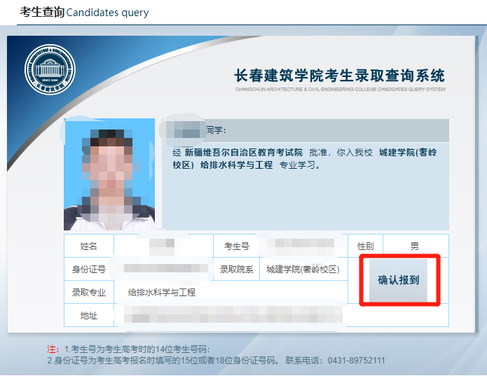 第四步:点击查询后会显示本人信息,确认是本人后,点击“确认报到”按钮,在弹出的对话框填写联系电话。