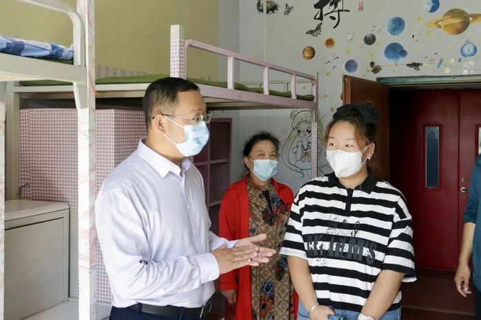 中秋佳节之际,为了解部分提前入校新生情况,帮助2022级新生更快适应大学生活,9月10日上午,学校校长张兴海,执行校长孙雷,党委书记王宝龙,党委副书记、副校长王玫等学校领导分别走访了新生宿舍,给新生带去董事长的亲切慰问和学校的关怀期望。