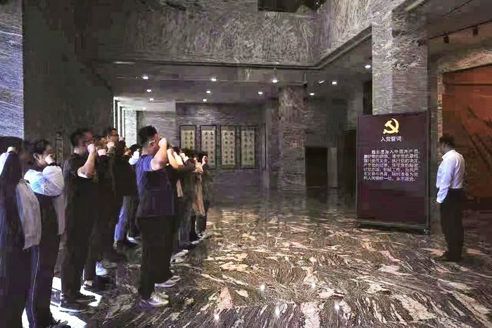 党员同志们在三下江南战役纪念馆内,面对鲜红的党旗,高举右拳,由王宝龙领誓,重温入党誓词。党员们整齐洪亮的声音回响在每个人的心中和耳畔,入党之时的初心再次得到了升华。