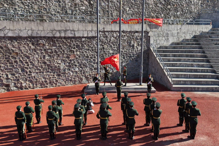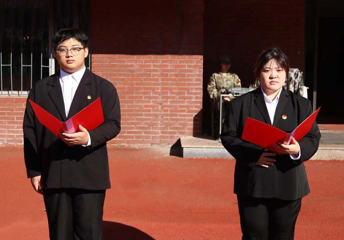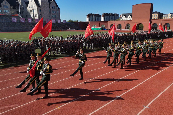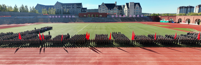清晨,迎着徐徐微风,国旗护卫队身着笔挺制服,迈着铿锵步伐护送国旗至旗杆下。伴随着《义勇军进行曲》激昂旋律,五星红旗冉冉升起,全体新生肃立行注目礼,嘹亮国歌声中,爱国情怀激荡心间。