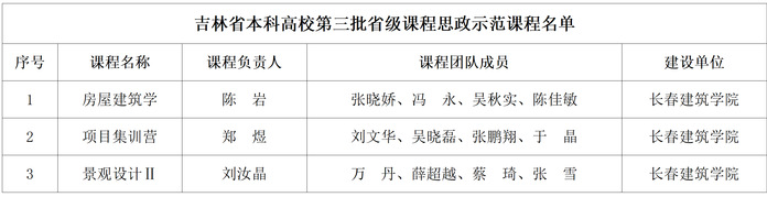近日,吉林省教育厅下发了《关于公布吉林省本科高校第三批省级课程思政示范课程名单的通知》,学校的《房屋建筑学》《项目集训营》《景观设计Ⅱ》三门课程获批为省级课程思政示范课程,为学校推动课程思政高质量发展注入新动能。