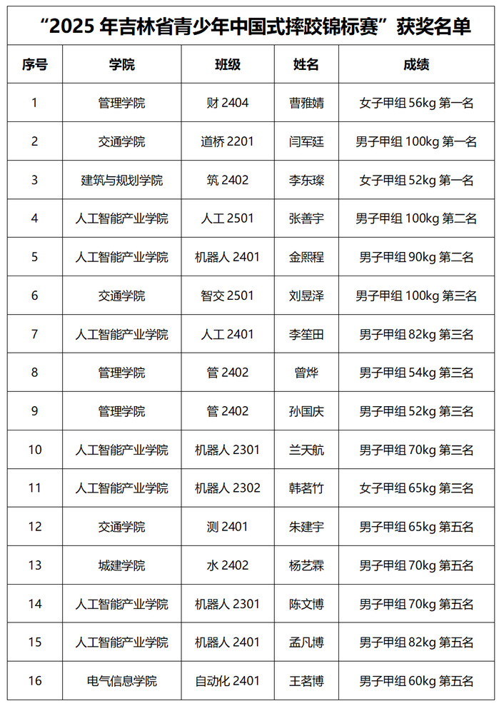 10月24日,由吉林省体育局主办、吉林省体育局重竞技运动管理中心承办的2025年吉林省青少年中国式摔跤锦标赛在长春欧亚卖场综合展厅圆满落幕。学校摔跤队选派16名运动员参赛,在为期三天的角逐中展现出强劲实力与拼搏精神,最终斩获3金2银6铜的优异成绩,并有5名选手跻身单项第五名,获高校组奖牌总数第三名,同时学校代表队荣获体育道德风尚奖集体荣誉。