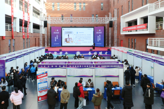 长春市人社局党组成员、市人才中心主任李钢,双阳区人社局党组书记、局长韩福辉,学校党委副书记张冀男等到会指导。长春市人才服务局、双阳区人社局、双阳区人才交流开发中心相关人员、学校各学院党总支书记(副书记)、毕业班辅导员及1000余名学生参加。