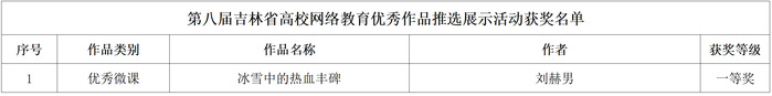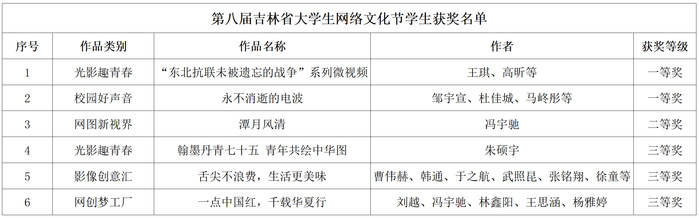近日,第八届吉林省大学生网络文化节和全省高校网络教育优秀作品推选展示活动评选结果揭晓。学校推选的网络文化及网络教育优秀作品获一等奖3项、二等奖1项、三等奖3项。
